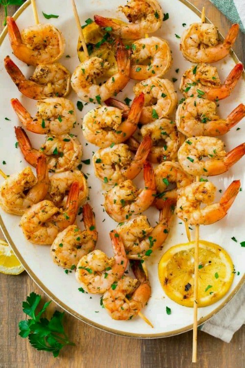 Prep work should only take about 5 minutes, and then you grill the shrimp 2 to 3 minutes per side. I really prefer having my shrimp on skewers, but you can still enjoy this recipe without them. In which case, you would either grill them directly on the grill if they are large enough or bake them in the oven if they are smaller kind. Also when using wooden skewers, it is recommended that you let them soak in water for a good hour before threading the shrimp on them.