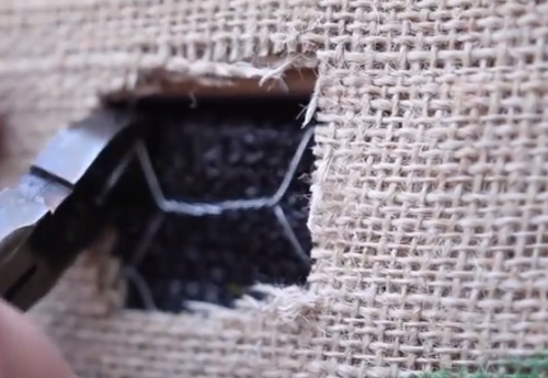 The burlap is attached outside the box, on top of the chicken wire