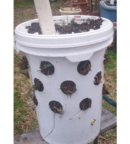 Plant your strawberry roots from the bottom up, starting with the bottom row. This bucket holds 25 plants i.e. 3 rows of seven and four on the top. The wood mulch stops the potting mix from falling out.