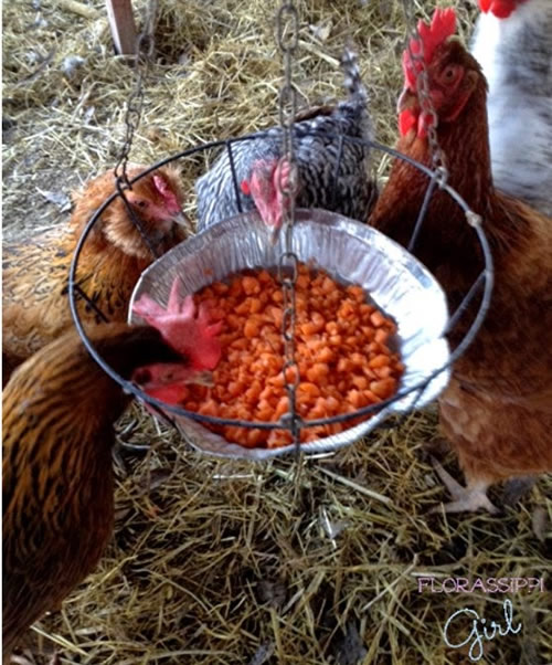You may need to add wire or string in order to lower the holder, especially if you have a coop with a high roof. For an outside location, then an extra stand may have to be erected to support the basket. Alternatively, you could just attach it to the lower branches of a tree. Now you can easily offer smaller grains and treats to your girls. 🙂