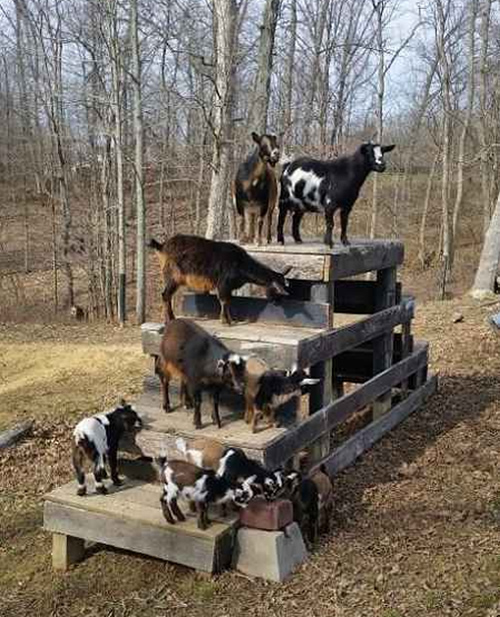 Wood pallets are great for building climbing platforms, just be creative and lay your pallets on top of each other or even against each other. You can also lay tires on the ground and fill them with cement or concrete to get the same effect. Lastly, introducing an old small trampoline can also provide hours of fun for your goats both young and old.