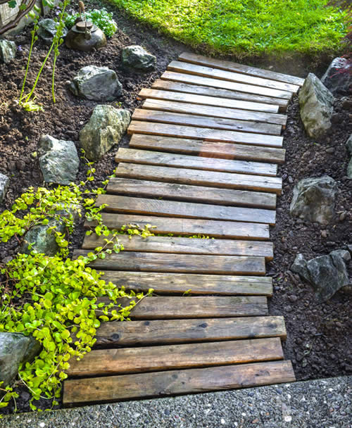 I believe that just because you live off grid or on a homestead in the middle of nowhere, it does not mean you cannot enjoy the ‘finer’ things in life. That is why we have taken on projects like the diy wood fired hot tub and the diy wood pallet sofa. The other day I found this diy wood pallet garden walkway idea.