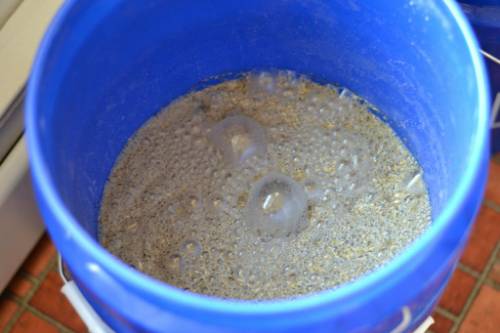 Cover the feed with enough water for it to ferment for at least 3 days. Ideally you want three sets of buckets to allow the system to run for 3 days. You empty one set every single day or night, then you refill it so that it is ready within 72 hours. The first day you can use overnight soaked feed, but the more days the more probiotics.