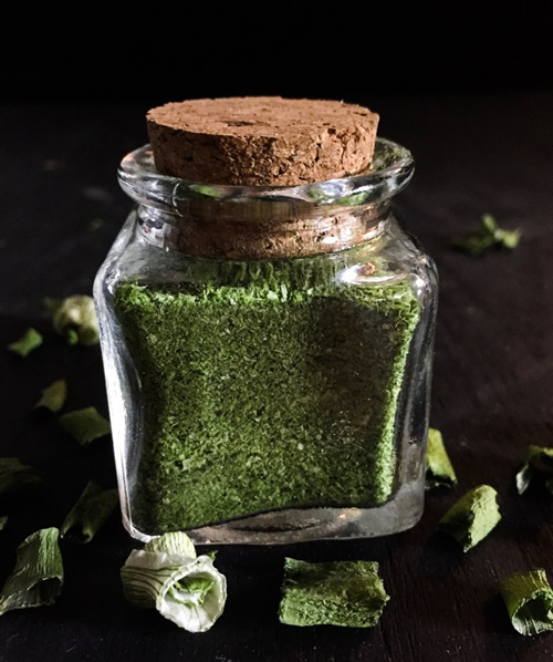 The onion should be crisp and brittle when done. At which point they will be ready for the final stage in the spice grinder. At the end of it all you should have a nice flavorful green powder, which can be stored in a glass jar or an airtight container. Store in the same cool area that you keep all your herbs and spices. 🙂