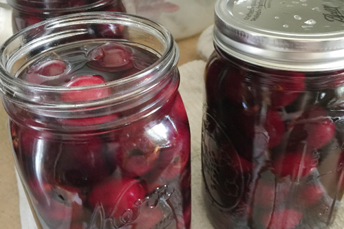 The cherries will need to be pitted before you can begin. The fastest and easiest way to do this will be using a pitting tool. Add water and sugar into the pot, bring to a boil and then let simmer. In each jar you will start with the cherries, and then fill to about an inch below the rim with the syrup. Remove any bubbles that may have formed, before wiping the rims and screwing on the lids with the rings in place.