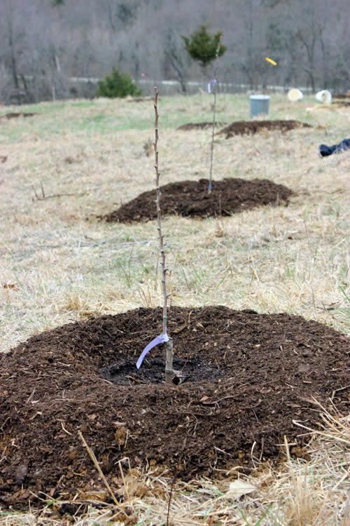 Dig your hole to about 2 feet deep, then rough up the bottom as well as the sides. This apparently will help your roots get a good grip. Center your plant and then refill your hole. Water well before covering the hole with mulch. If you have rabbits in your area, a fence may be needed around the trunk.