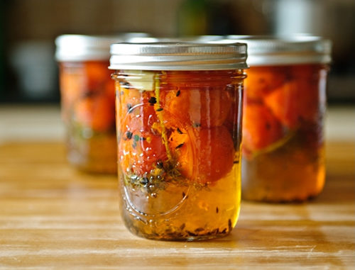 Since you will be using jars, it is important that you wash them and sterilize them. The easiest way is to use the water bath canner or you can just use a large stock pot with boiling water. One lazy day, I decided to skip the process of making a small hole in each of the tomatoes. Don’t do it, the flavor is not the same.