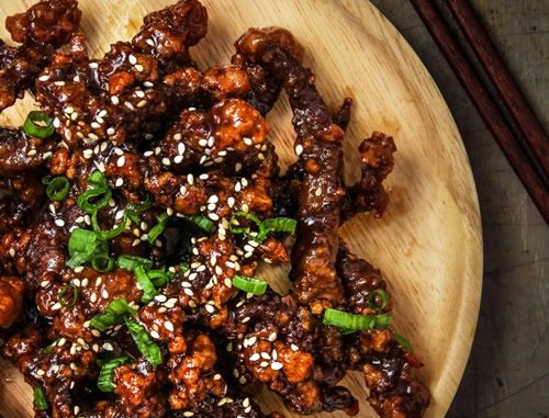 Prepare your marinade in your food processor as instructed. Your steak has to be sliced into strips about half an inch wide, then you can add the marinade to it and let it sit for up to an hour in the fridge. After marinating the beef, it is lightly dusted with corn starch and then deep fried for a minute or two. When you are done frying the beef, you can then make the sweet and sticky sauce in a small pot. As soon as the sauce is ready, add the beef. Voila it’s ready to serve.